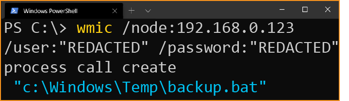 wmic /node:192.168.0.123 /user:"REDACTED" /password:"REDACTED" process call create "c:\Windows\Temp\backup.bat"