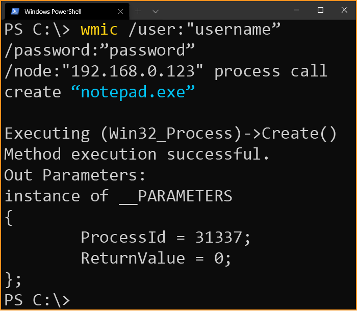 wmic /user:"username” /password:”password” /node:"192.168.0.123" process call create “notepad.exe”