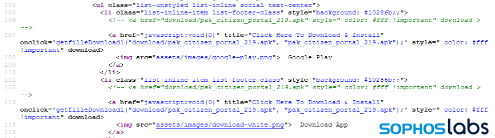 マルウェアのターゲットユーザーは、偽の Pakistan Citizen Portal の Web ページからアプリをダウンロードするように指示する SMS メッセージまたはメールでリンクを受信した可能性があります。なぜ偽のドメインを追加するために Web ページを改ざんする必要があったのかは不明です。