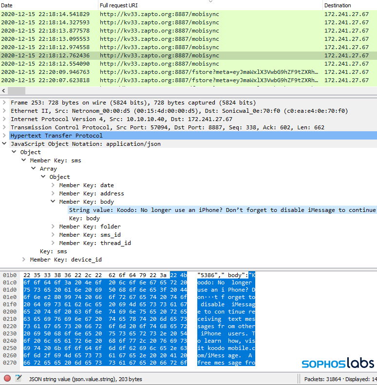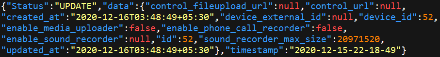デバイスからデータをアップロードする過程で、マルウェアはこれらの機能を参照するコンフィギュレーションを受け取っていました。コンフィギュレーションは、JSON 形式のプレーンテキストでした。