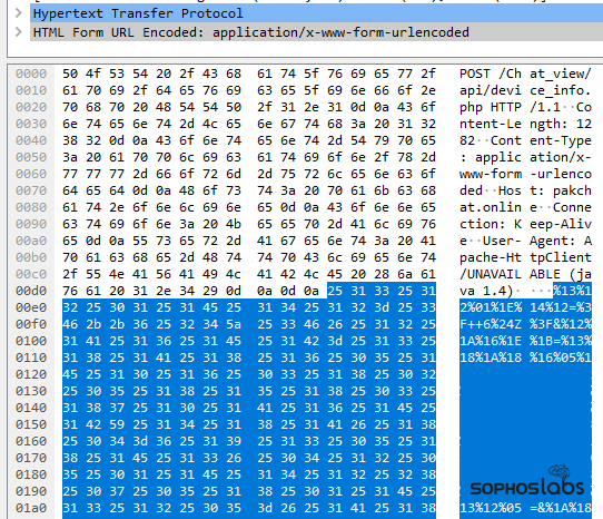 これらの情報を送信したすぐ後に、アプリは DEX ペイロードを取得し、一連のデータのバーストを HTTP POST へ本格的に開始します。ほとんどの場合、ペイロードの名前は class.dex ですが、トロイの木馬化された TPL Insurance アプリの場合、class_tpl.dex というファイル名となっています。