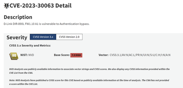 図 1: NVD への CVE-2023-30063 のエントリ。v3.1 でのベーススコア (7.5、高) とベクトル文字列に注目してください。また、2024 年 3 月段階では、NVD には依然として CVSS v4 のスコアが使用されていないことにも注意してください。