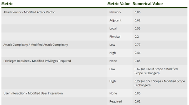 図 2: FIRST の CVSS v3.1 ドキュメントからの抜粋。各種メトリクスの数値を示しています。