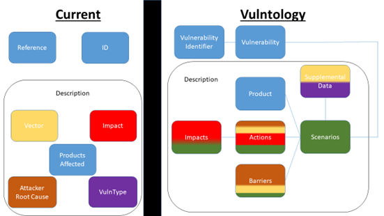 Vulntology (「脆弱性」と「オントロジー」の合成語) は、脆弱性を、どのように悪用される可能性があるか、悪用された場合の潜在的な影響、および脆弱性の緩和要因に従って特徴付ける NIST 主導の取り組みです。脆弱性の説明記述 (ベンダーによる勧告やセキュリティ情報など) の標準化、その種の記述をより詳細にすること、脆弱性情報の言語の壁を越えた簡単な共有などを目的として出発しました。「vulntology に即した表現」の例は、こちらで入手できます。