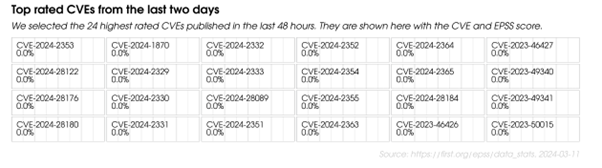 図 1: EPSS Data and Statistics ページのスクリーンショット。画像がキャプチャされた時点での過去 48 時間の EPSS スコア上位を示します。EPSS は、これらの CVE の多くが最終的に悪用されるとは結論づけていないことに注意してください。