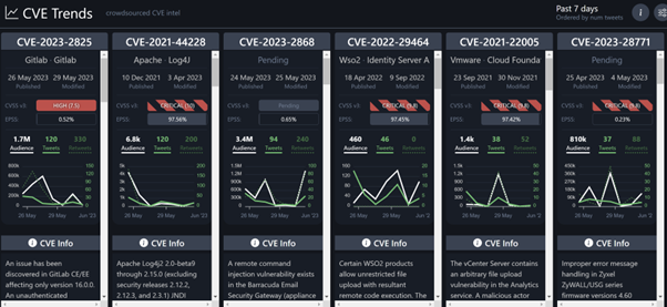 上記のスクリーンショットに示すように、ダッシュボードには CVSS と EPSS のスコア、CVE 情報、ツイートおよび Reddit への投稿のサンプル、「公開」日、過去数日間 (または 24 時間) のアクティビティの測定結果が記載されています。