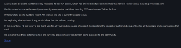 前述の通り、CVE Trends は 2023 年半ばから活動を休止しています。本記事執筆時点で、このサイトへの訪問者には次のようなメッセージが表示されます。このメッセージは、制作者の Twitter フィードの最後のメッセージにもなっています。
