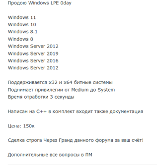 図 7: 犯罪フォーラムで Windows のローカル権限昇格エクスプロイトを販売するユーザー