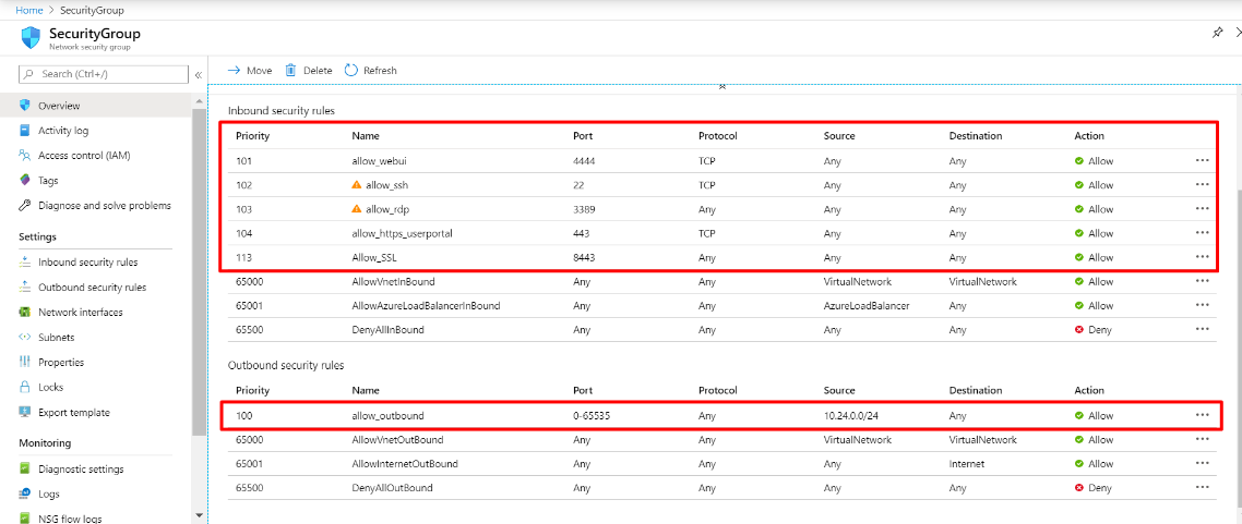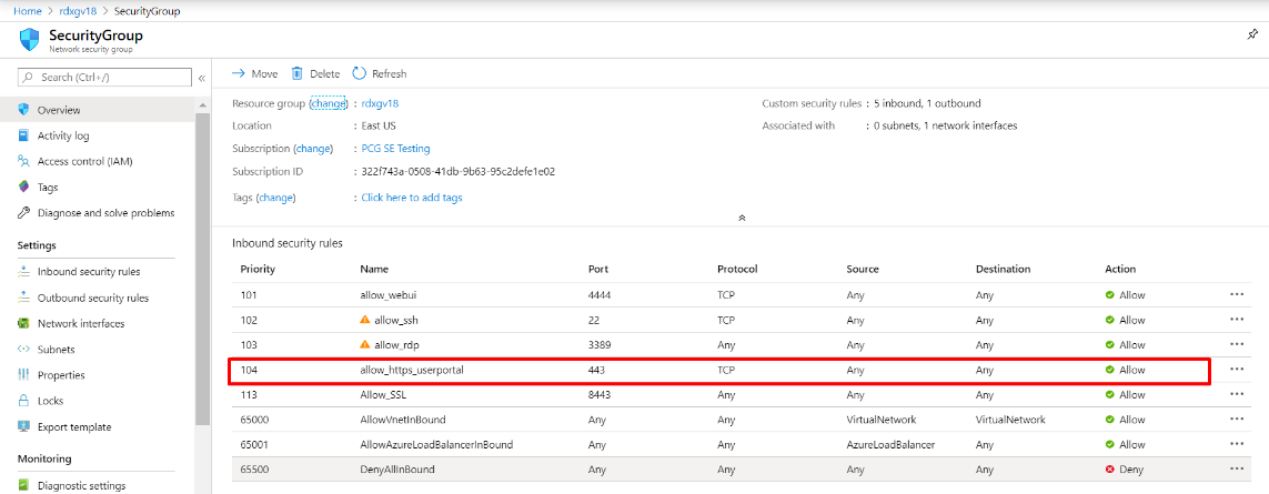 - In the Azure console, access to port 443 for user portal access (customizable) should be allowed for inbound traffic in the security group attached to port B (public interface).