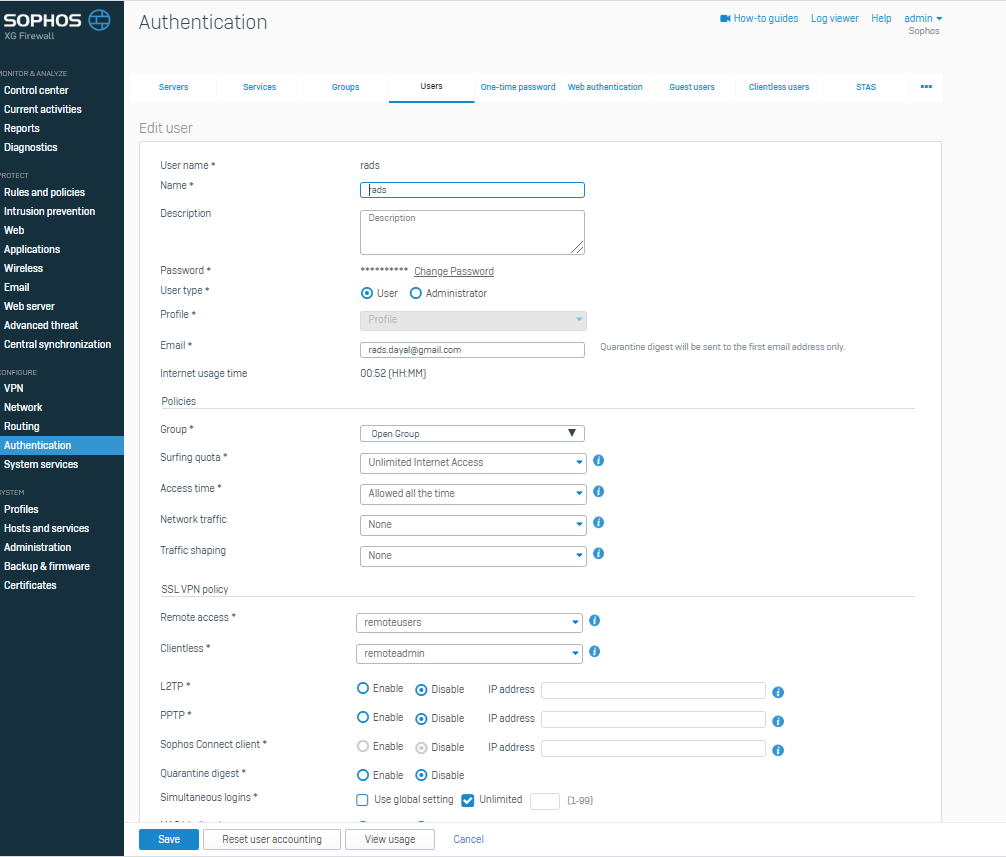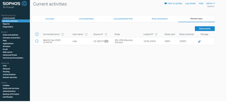The administrator for XG Firewall in Azure has complete visibility of remote users in the cloud. The firewall logs and reports clearly demonstrate the footprints of a remote user, and in the case of a suspicious event, the administrator can easily disconnect the remote user at any given point.