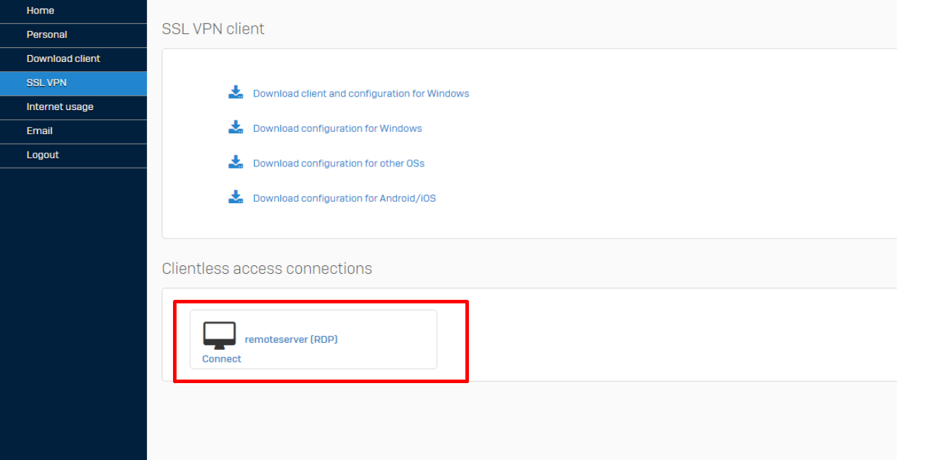 A full tunnel configuration like SSL VPN allows remote users to upload and download content to and from the server. As this might prove to be a security concern for your organization, XG Firewall provides clientless VPN for more granular control. This option allows users to just view the contents of the internal resource without making any changes.