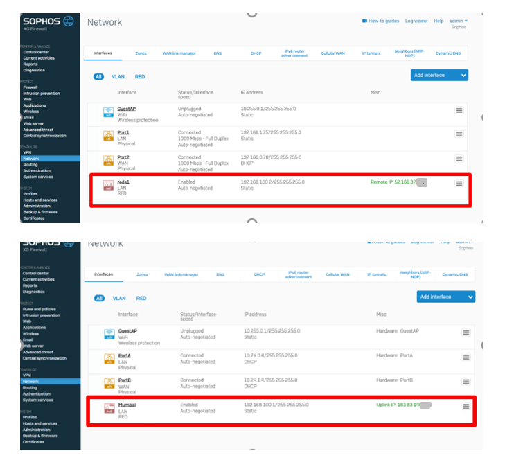 - Once configuration is complete, view the SD RED client and server firewall with the RED tunnel established in your XG Fireall console as shown below.