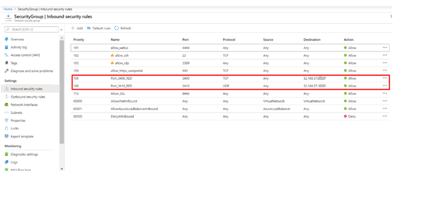- In the Azure console, ensure an inbound rule is marked in the security group attached to port B (WAN interface for XG Firewall) for allowing TCP 3400 and UDP 3410 to the XG Firewall public IP.
