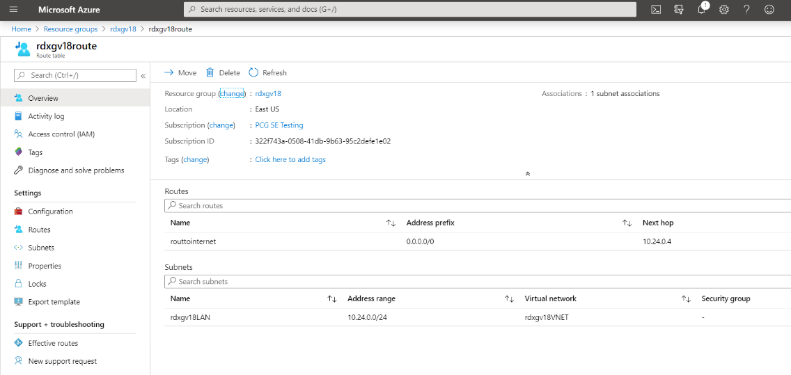 - Ensure that a route table is created and is associated with the internal LAN. The route should be configured for all traffic, with the next hop as the XG Firewall’s LAN interface (Port A). This is required to route the traffic of the internal virtual machine via the XG Firewall interface.