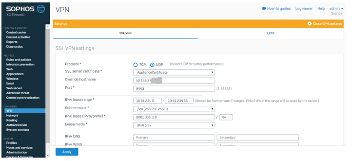 - Important: The Azure Virtual Network NAT associates the private range IP associated with Port B with the remote user’s public IP. Hence, it becomes essential to enter the “Override hostname” in the field shown below with the Azure public IP. To enter the override hostname, navigate to CONFIGURE > VPN > Show VPN Settings > SSL VPN in the XG Firewall administrator console. This will ensure that when the user downloads the config file, they can connect to the XG Firewall in Azure on their public IP.