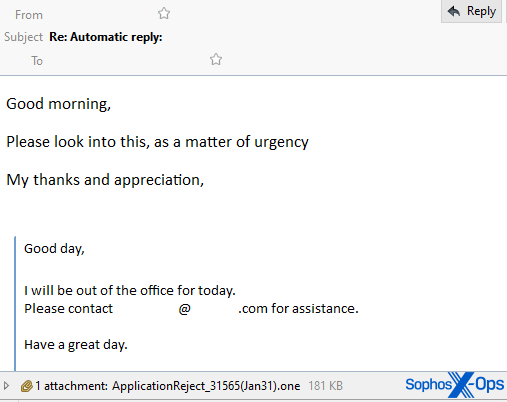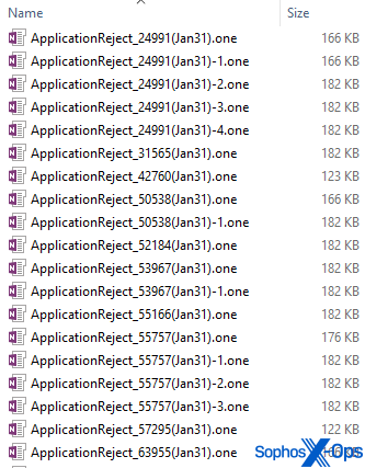 このメッセージのタイトルは、感染したコンピュータのメールボックスで使用されている任意のテキストが使用されており多岐にわたります。しかし、すべての添付ファイルの名前は ApplicationReject_#####(Jan31).one または ComplaintCopy_#####(Feb01).one (##### はランダムな 5 桁の数字) となっていたため、簡単に見つけることができました。