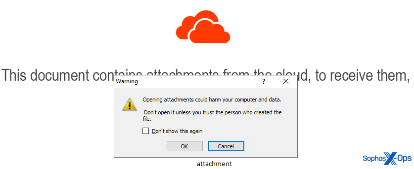 ソフォスは、ドキュメントを開くと、OneNote によって生成された警告ダイアログボックスが少なくとも 2 つ表示されるのを確認しました。そのうち 1 つは大切なアドバイスであるため、ここで繰り返しご紹介します。「添付ファイルを開くことで、あなたのコンピュータやデータに害を及ぼす可能性があります。ファイルを作成した人を信頼できない限り、開かないようにしましょう。」