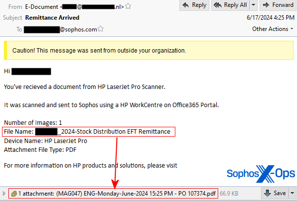 メッセージの件名は、オフィス内のネットワーク接続されたスキャナから直接電子メールで送信された文書を模しており、社内で作成されたメールを装っていました。