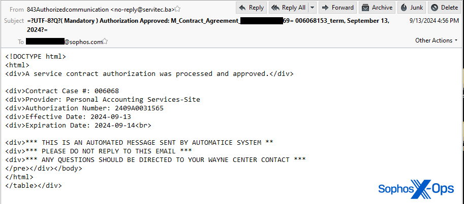 (なお、クイッシングメールが確認されたのはこれが初めてではありません。 2 月と 5 月にも同様のメールがソフォスの従業員に送信されていました。ソフォスのお客様も少なくとも 1 年前から同様のキャンペーンに狙われていました。X-Ops が今回、ソフォスを標的とした攻撃に焦点を当てることにしたのは、攻撃の全容を調査し、共有できるためです。)