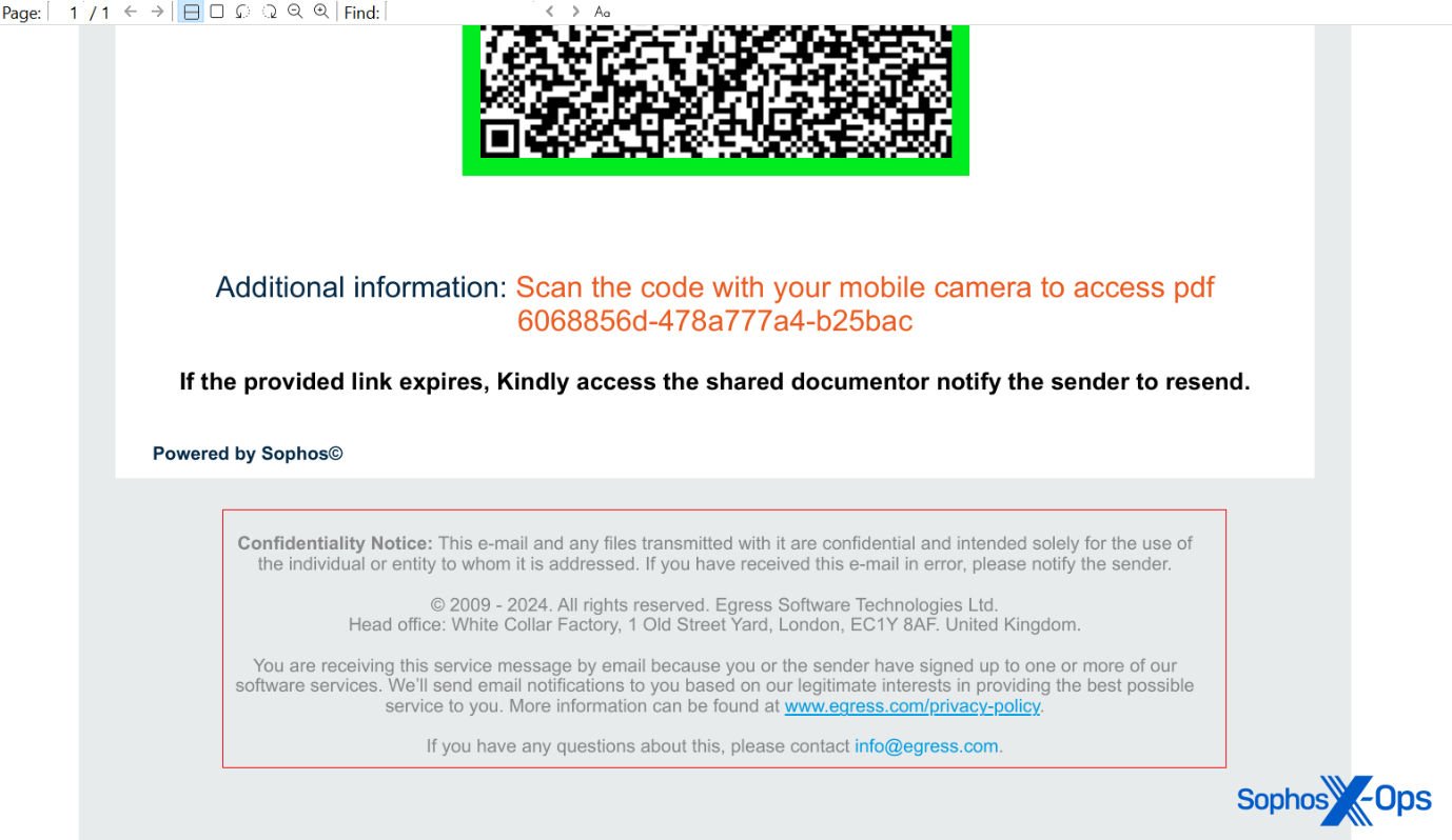 2024 年 6 月、ソフォス社内の複数の従業員に対して、QR コードを含む PDF 文書が電子メールの添付ファイルとして送信されました。このスピアフィッシングメールは正規のメールに見えるように細工されており、流出した正規の、ソフォスではないメールアカウントを使用して送信されました。