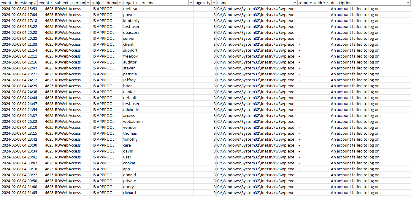 これらのインシデントを調査した結果、RD Web Access ポータルを提供する IIS プロセスに対して継続的なブルートフォース攻撃が試みられていたことが確認されました。