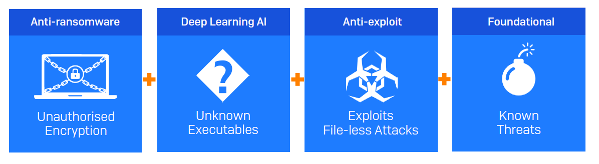 Sophos Intercept X は、エンドポイント、サーバー、モバイルデバイスに世界トップクラスの保護機能を提供します。Intercept X は、次のような何層ものテクノロジーレイヤーを使用して、キルチェーンの複数のポイントで攻撃者を阻止します。
