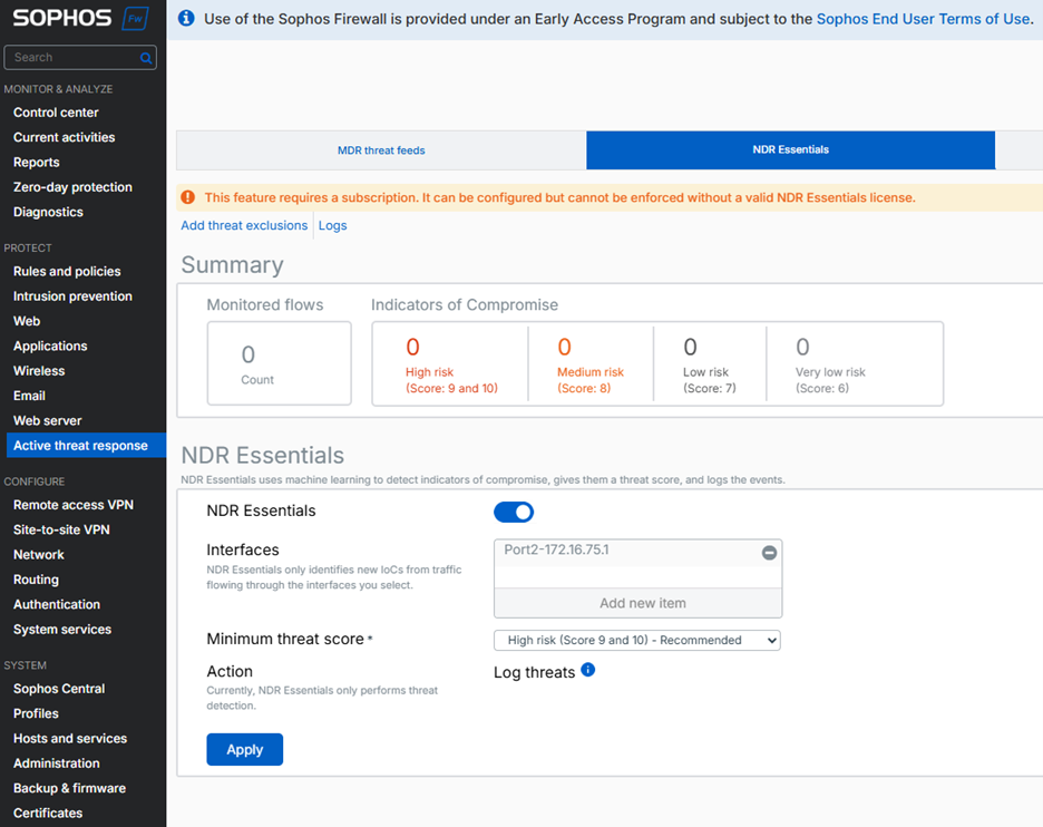 新しい NDR Essentials 脅威フィードは、上のスクリーンショットに示すように、ファイアウォールの Active Threat Response エリアで他の脅威フィード (Sophos X-Ops フィード、MDR フィード、サードパーティフィード) と共に管理されます。スイッチをオンにして、監視する内部インターフェースを選択し、検出リスクの最小しきい値を設定するだけでセットアップは簡単に完了できます。