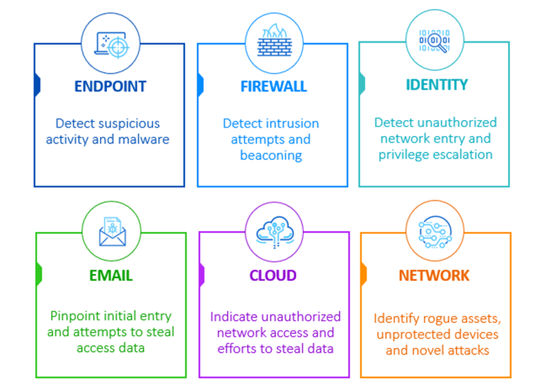 エンドポイント、ファイアウォール、アイデンティティ、メール、クラウド、ネットワークの各セキュリティソリューションはすべて貴重な知見を提供することができ、熟達したセキュリティアナリストが高度な攻撃を検知し対応するために役立ちます。