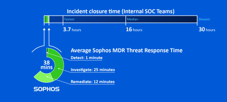 このように環境全体から収集されるテレメトリを活用することで、Sophos MDR は他のベンダーよりも早く脅威を検知し、無力化できます。Sophos MDR が脅威を特定して対応するまでに要する平均時間はわずか 38 分であり、他のセキュリティベンダーよりも圧倒的に速く、処理が最も迅速な社内のセキュリティチームと比較しても 5 倍以上早く問題を解決できるという利点がもたらされます。