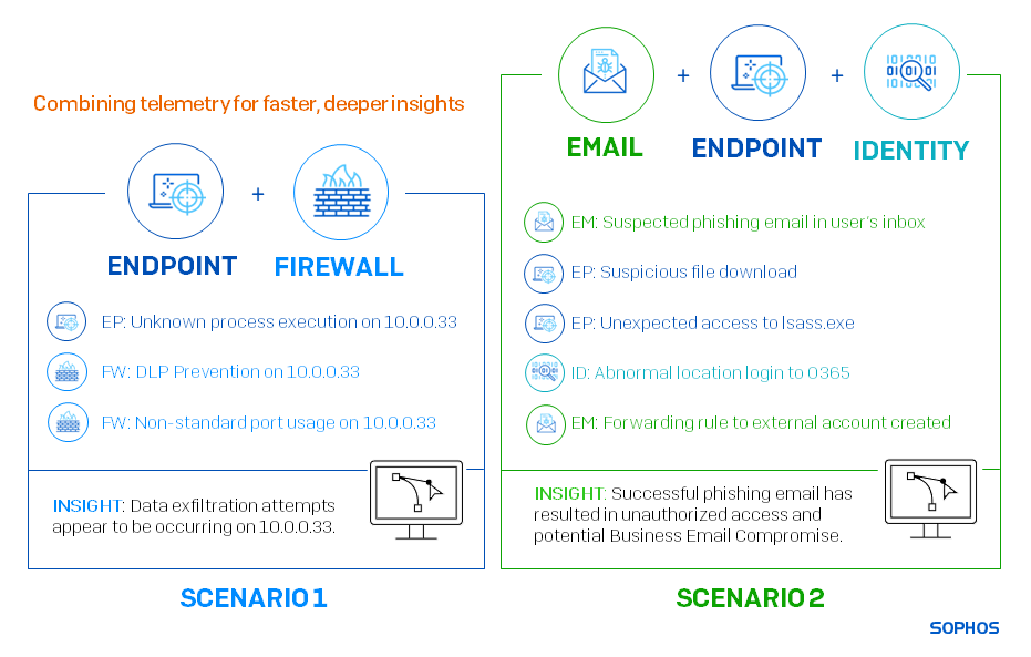 上図のシナリオ 1 に示すエンドポイントのシグナルとシナリオ 2 のメールのシグナルは、それぞれ攻撃を示している可能性があります。この時に、ファイアウォールやアイデンティティ (ID) のテレメトリなどのデータを活用することで、アナリストは、シナリオ 1 ではデータの流出、シナリオ 2 ではビジネスメール詐欺 (BEC) であることをより正確に特定できます。