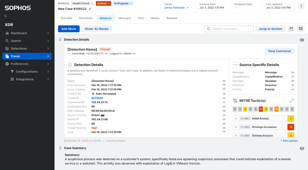 Sophos XDR は、検出結果に基づいてケースを自動的に作成し、調査の優先順位付けを支援します。ケースの自動作成機能の強化に加え、改良されたケース管理機能により、アナリストは調査の作業量を管理しやすくなり、他のチームメンバーとより効率的に協力できます。