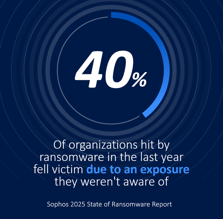 過去 1 年間にランサムウェア攻撃を受けた組織の 40% が、認識していなかった脆弱性が原因だったとしています1。Sophos Managed Risk は、この課題に対応するため、内部攻撃対象領域管理 (IASM) の機能を追加しました。