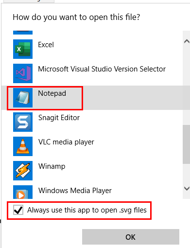 これを行うには、こちらのような本物の SVG グラフィックをデスクトップにダウンロードします。ダウンロードしたファイルを右クリックし、[プログラムから開く] -> [別のプログラムを選択] を選び、ブラウザ以外 (メモ帳など) を選び、[常にこのアプリを使って .svg ファイルを開く] チェックボックスをオンにします。