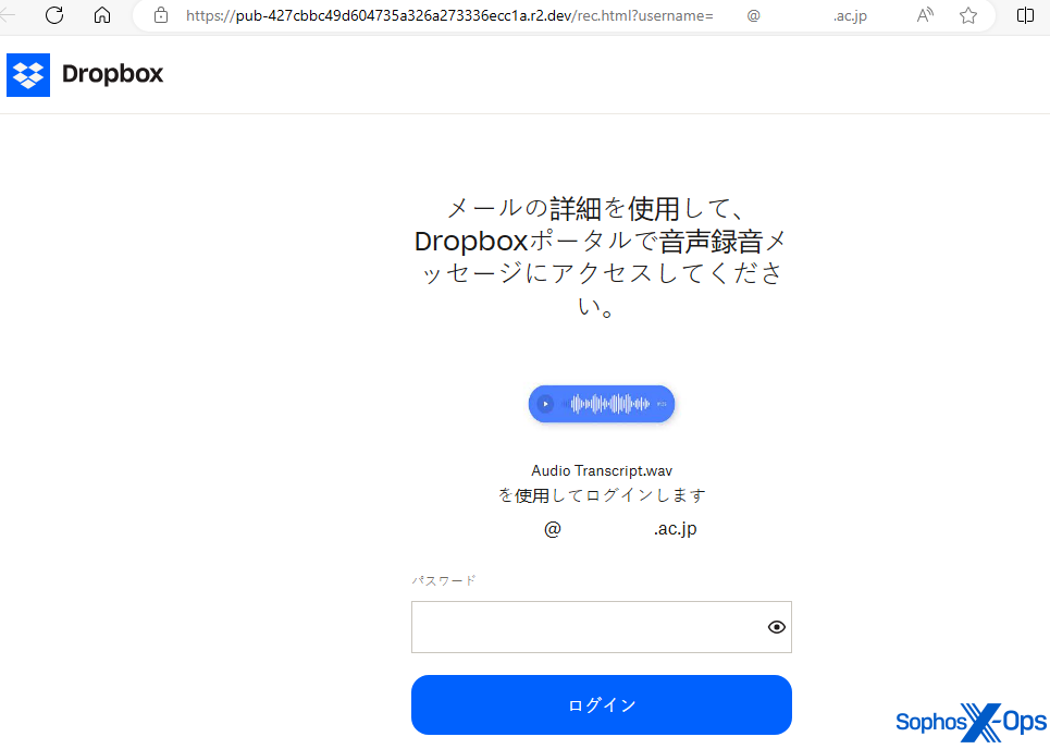 最終的には、受信者のトップレベルドメインに基づいて、異なる言語をターゲットにしたバージョンも見つかりました。たとえば、日本の学術機関に勤める標的宛の電子メールと、そこに埋め込まれた SVG は、どちらに日本語で作成されていました。その結果、非常にリアルで日本語にローカライズされた Dropbox のログイン画面が再現されました。