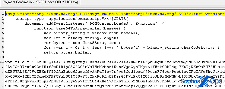 最後に、ソフォスが検出したもうひとつの SVG ファイルには、base64 としてエンコードされた大量のデータが含まれているようでした。そのデータを解読したところ、2 つのファイルが格納されている Zip アーカイブであることがわかりました。