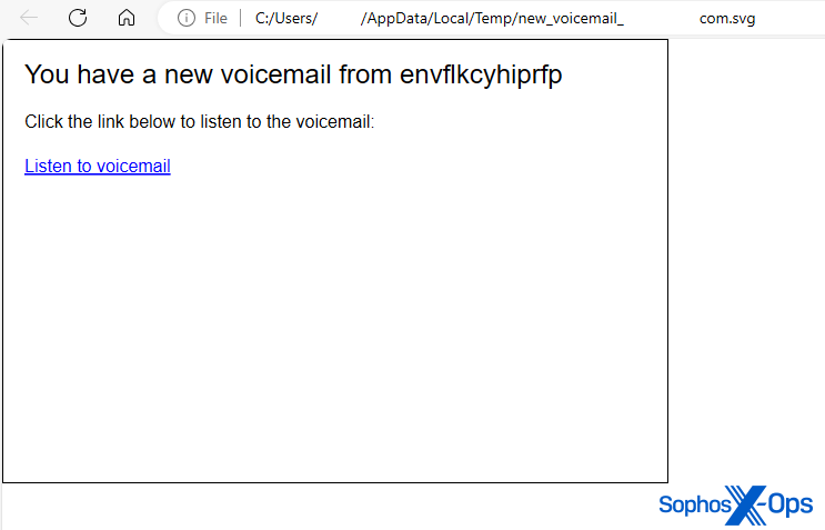 これらの悪意のある SVG ファイルのうち最も単純なものには、1 行または数行のハイパーリンクテキストが含まれており、電子メールのユーザー名の前に 「Click To Open (「クリックして開く)」 または 「Click the link below to listen to the voicemail (下のリンクをクリックしてボイスメールを聞く」)」 というフレーズが付加されます。