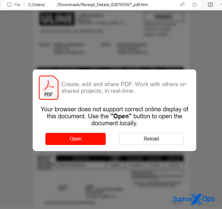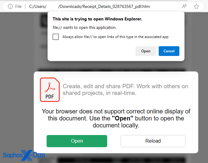 「共有ファイル」リンクをクリックすると、HTML ファイルがダウンロードされ、そのファイルを開くと、背景にぼやけた PDF 文書があるように見えるページが表示されます。