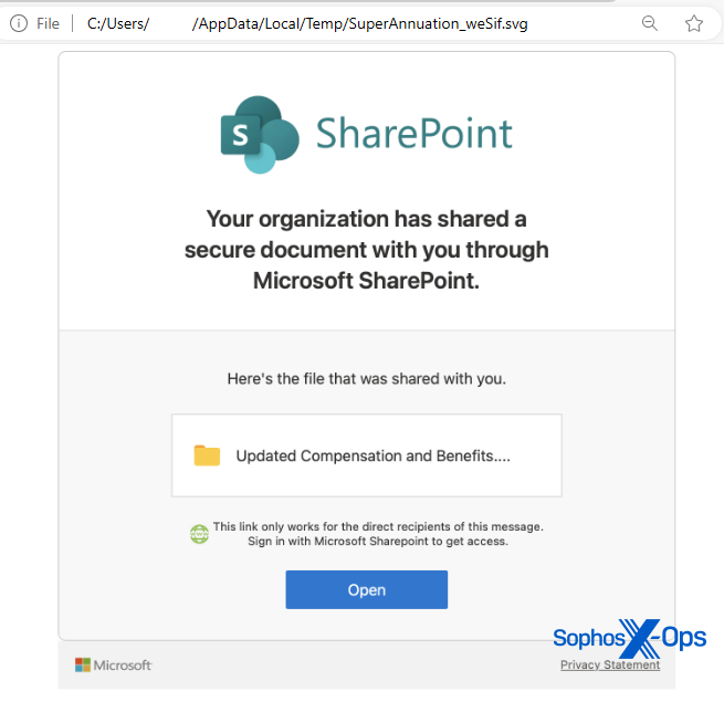 標的が SVG ファイルに埋め込まれたリンクをクリックすると、ブラウザによってリンクが開かれます。これにより、アカウントにログインする状況に標的が標的を誘い込むように設計されたソーシャルエンジニアリングが開始されます。