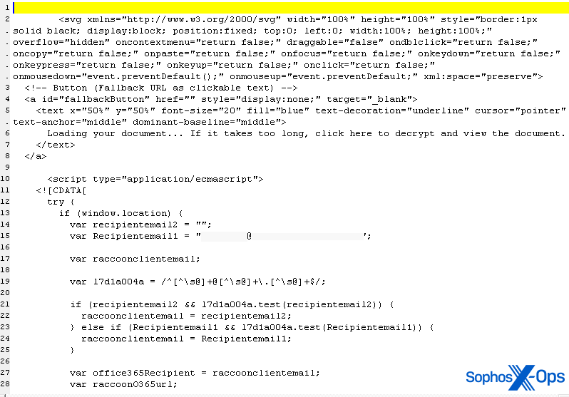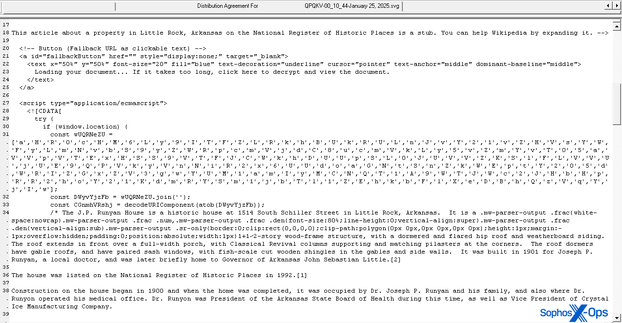 この脅威の IoC (セキュリティ侵害の痕跡) については、ソフォスの Github リポジトリに掲載されています。Central Email、SFOS、および一部のエンドポイント製品におけるスパム添付ファイルのサブタイプ (CXmail/EmSVG-C) の検出と、悪意のある SVG 添付ファイル (Troj/XMLPh-A、Troj/XMLPh-E、Troj/XMLPh-F、Troj/XMLDrp-AJ、Troj/XML-AV、Troj/XMLDl-K) のシグネチャベース検出が追加されました。
