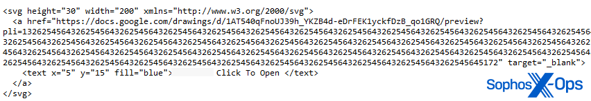 しかし SVG 画像はブラウザ内でネイティブに読み込まれ、レンダリングされるため、アンカータグやスクリプト、その他のアクティブな Web コンテンツを含むこともできます。そのため、このファイル形式は脅威者に悪用され続けています。攻撃で使用されている SVG ファイルには、長方形などの単純な図形を描画する命令が含まれていますが、別の場所にホストされている Web ページにリンクするアンカータグも含まれています。