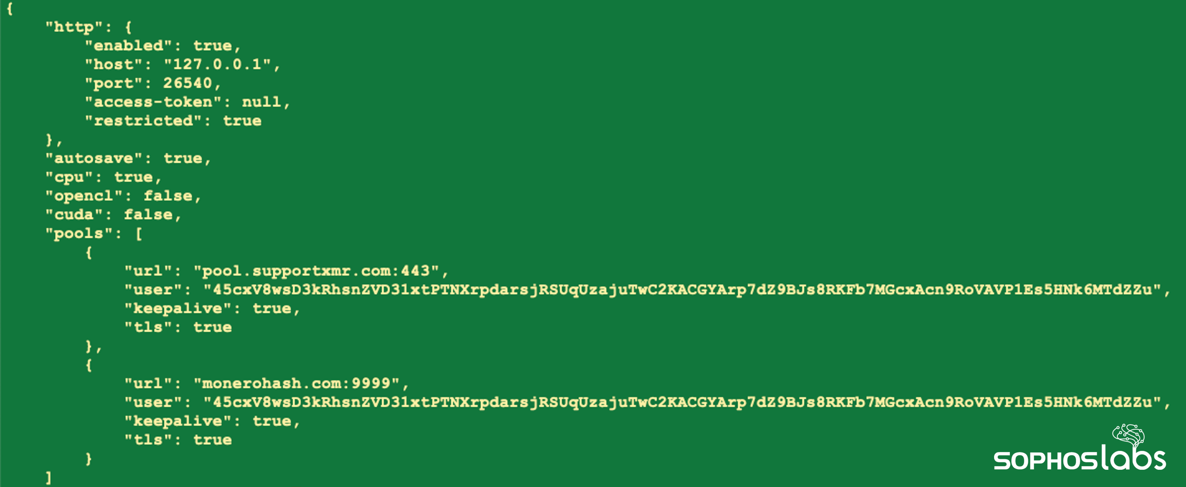 図 3: XMRig Miner マルウェアの構成情報を含んだ a.json の中身