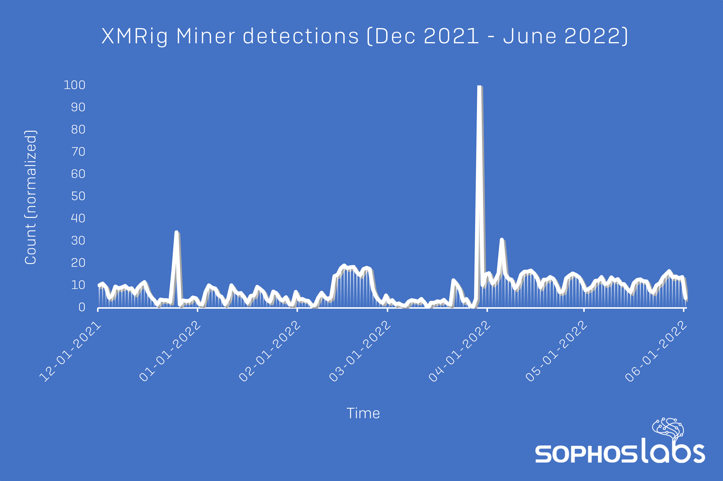 2021 年 12 月から 2022 年 6 月までの間における、XMRig Miner のソフォス製品による総検出数と対照すると、興味深い結果が得られます。2022 年 3 月下旬に大きな山が現れるまでは活動は低調になっており、その後、4 月から 5 月にかけて活発化し、持続しています。