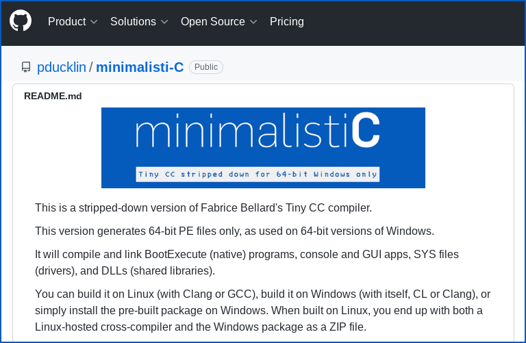 If you don’t have a C compiler installed, you can get a fantastic, free, ready-to-use, minimalistic Windows 64-bit compiler toolkit (under 400KB, including program, headers and libraries!) based on Fabrice Bellard’s Tiny C Compiler (TCC) from here: