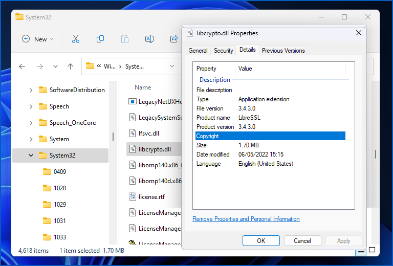 Yet our default install of Windows 11 has a DLL file called libcrypto.dll in its System folder, which is a filename typically associated with OpenSSL.