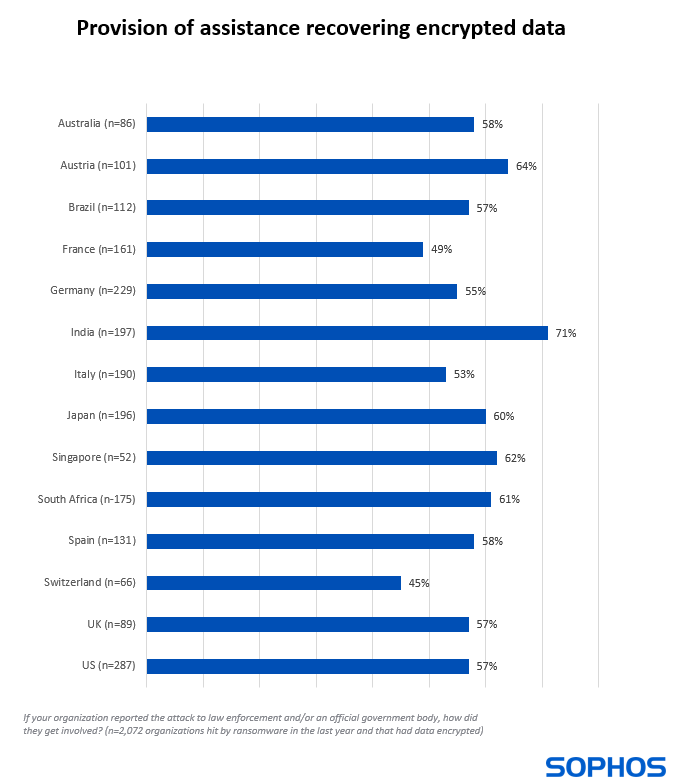 さらに掘り下げると、法執行機関や公的機関による支援の詳しい傾向は、その組織が拠点を置く場所によって異なることがわかりました。調査対象となったすべての国で、被害者の半数以上が攻撃に対処するためのアドバイスを受けていましたが、インド (71%) およびシンガポール (69%) の組織が、最も高いレベルの支援を受けたと報告しています。