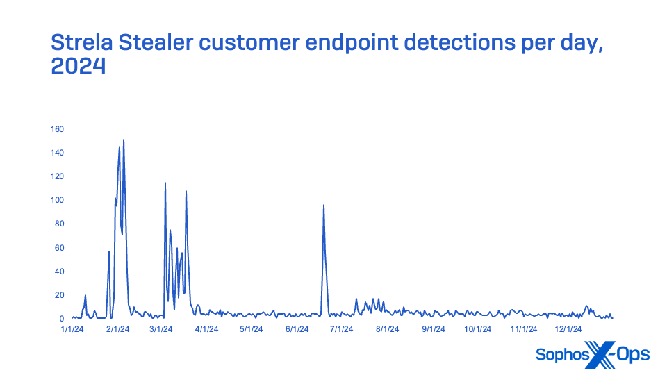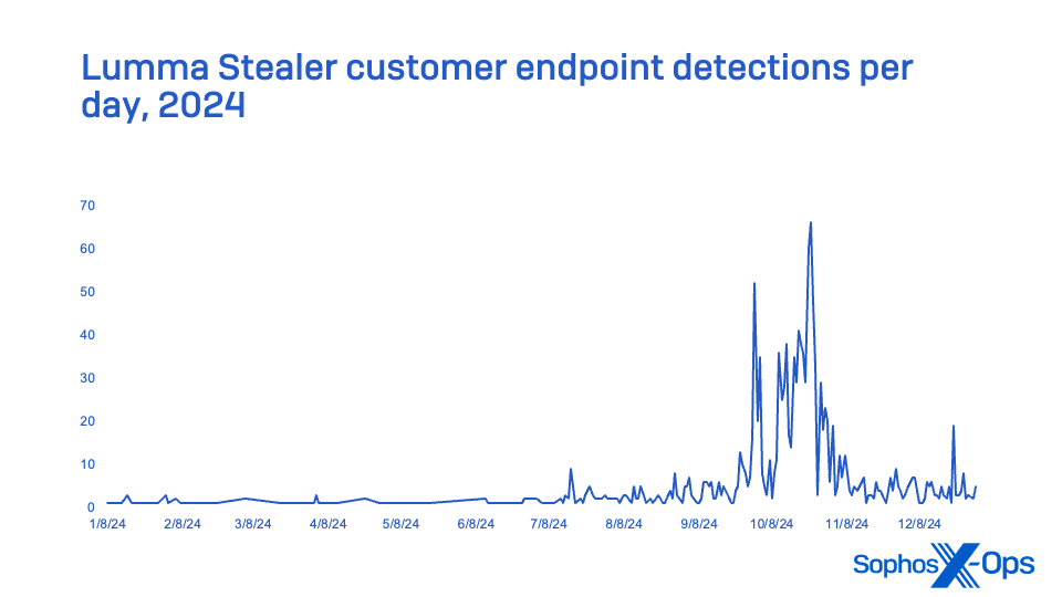 Lumma Stealer は、サービスとしてのマルウェア (MaaS) としてロシア語圏のフォーラムで販売されており、MDR インシデントで最も頻繁に確認された情報窃取ツールでした。エンドポイント検出レポート全体では 2 位を占めています。10 月に始まった大規模な Lumma Stealer キャンペーンにより、2024 年第 4 四半期には最も多く報告された情報窃取ツールとなりました。昨年の MaaS 情報窃取ツールの検出割合で首位を占めていた RaccoonStealer (インフラが破壊された後、2024 年に新バージョンをリリース) をはるかに上回り、年末には Strela Stealer (2023 年に順位を上げ、2024 年の初期にピークを迎えたが、下半期には低迷) をも上回りました。2024 年に追跡された MDR インシデントで、Strela Stealer に関係する事例はありませんでした。