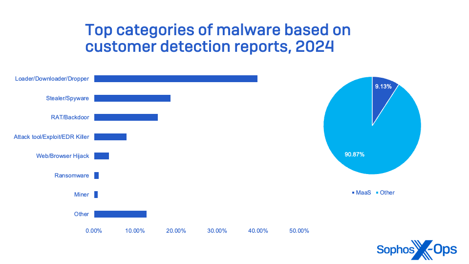 コマンドアンドコントロールツール、マルウェアローダー、リモート管理ツール、情報窃取マルウェアは、(ランサムウェアを除いて) 中小企業を標的とする悪意のあるマルウェアの大部分を占めています。厳密にはこれらのツールの一部はマルウェアではありませんが、ランサムウェアやその他のサイバー攻撃の展開に使用されています。