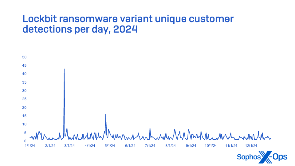 2024 年に最も多く検出されたランサムウェアファミリは LockBit でしたが、LockBit グループによる活動が原因ではありません。2024 年 2 月、米国と英国の法執行機関は、RaaS (サービスとしてのランサムウェア) グループのサーバーを押収し、メンバーのうち 2 人を逮捕、1 人を起訴することで、LockBit グループを壊滅したと発表しました。これを受けて、流出した LockBit 3.0 のコードに基づく多数の亜種が広く活動するようになり、結果として 2024 年初頭に LockBit の検出数が急増しました。しかし、3 月までに検出数は大幅に減少し、4 月から 5 月初旬にわずかに回復したのみに留まりました (ただし、LockBit の攻撃者が完全に消滅したわけではありません)。