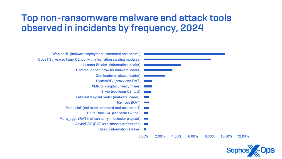Sophos MDR および IR のインシデントで確認された上位 10 件のツールおよびマルウェアのうち、これらのカテゴリに該当しないのは XMRig のみです。XMRig は暗号通貨をマイニングするマルウェアで、アクセス権が販売されたり、ランサムウェアの攻撃者によって悪用されたりする前に、受動的に収益を上げるために使用されます。